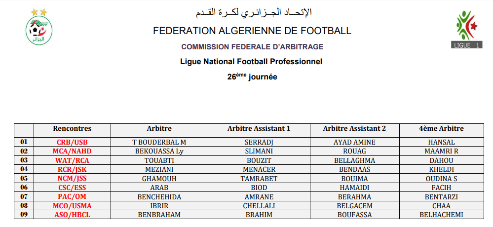 عينت لجنة التحكيم، الحكم أعراب لإدارة قمة الجولة الـ26 من البطولة المحترفة، والتي ستجمع بين وفاق سطيف وشباب قسنطينة.