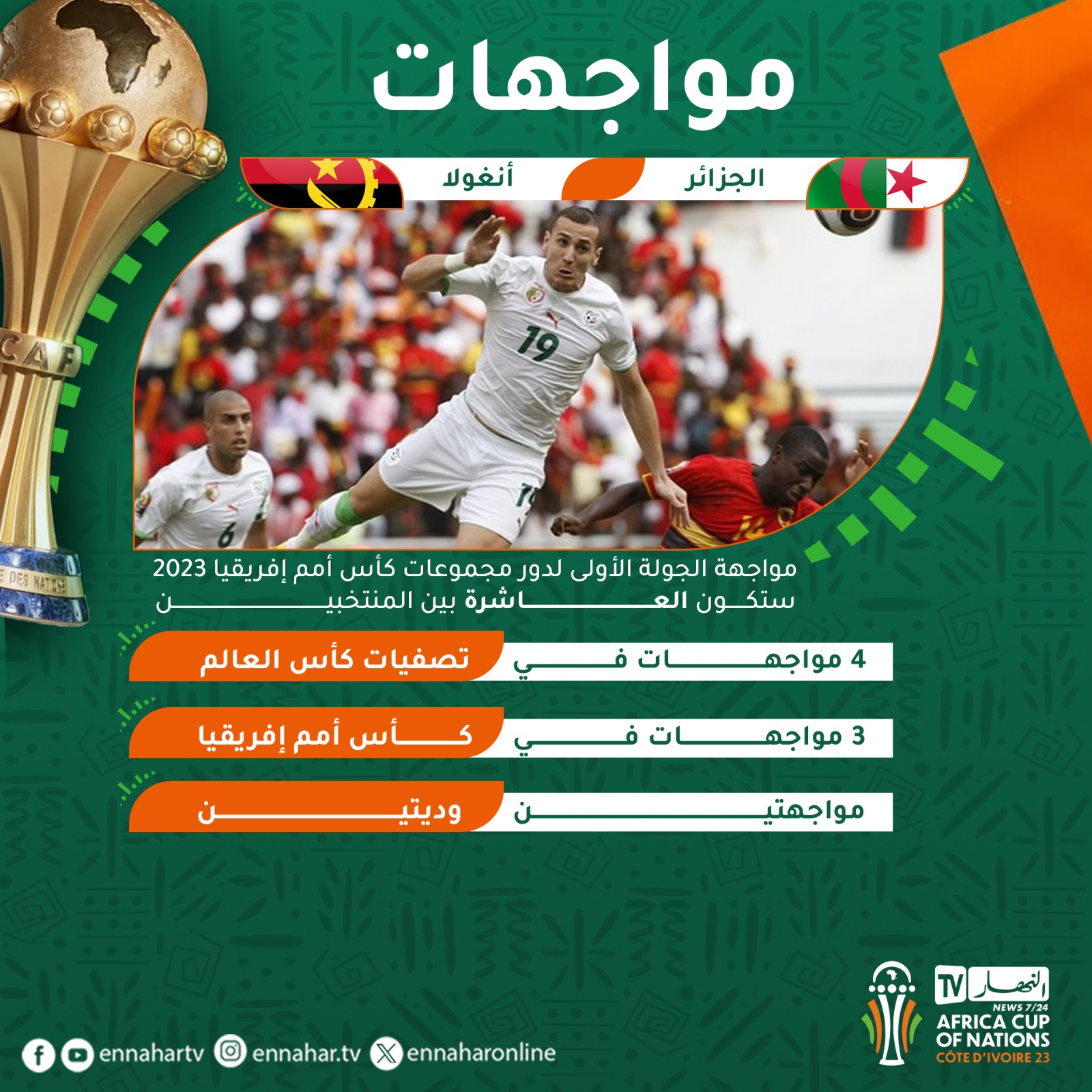 يفتتح المنتخب الوطني. مشواره في كأس أمم إفريقيا 2023 بالكوت ديفوار. برسم الجولة الأولى لدور المجموعات. بمواجهة المنتخب الأنغولي.