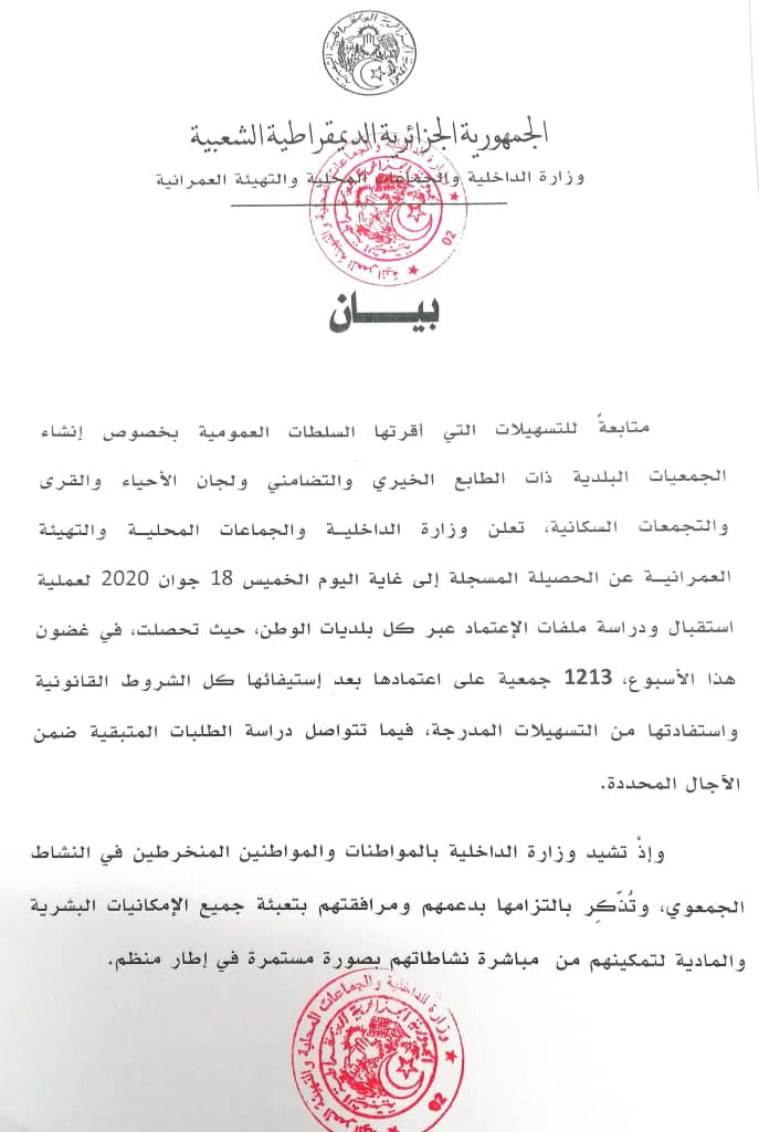 أعلنت وزارة الداخلية والجماعات المحلية التهيئة العمرانية أن 1213 جمعية تحصلت على إعتمادها في غضون أسبوع.