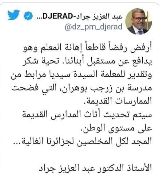 وغرد جراد على تويتر “أرفض رفضاً قاطعاً إهانة المعلم وهو يدافع عن مستقبل أبنائنا. تحية شكر وتقدير للمعلمة السيدة سيديا مرابط من مدرسة بن زرجب بوهران، التي فضحت الممارسات القديمة”.