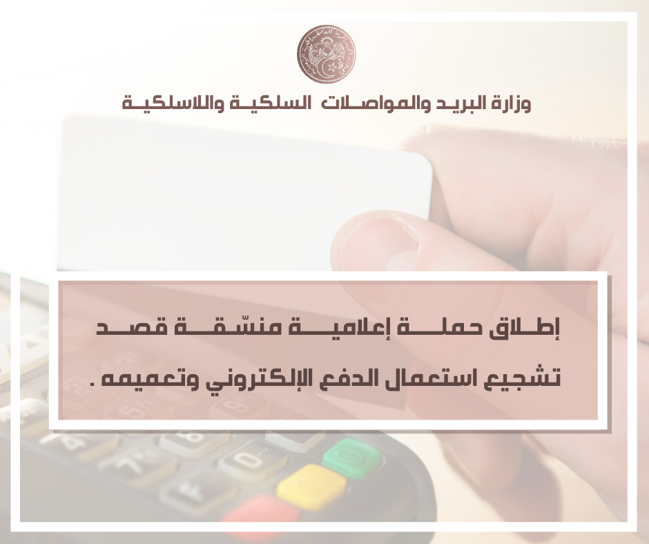 أعلنت وزارة البريد والمواصلات السلكية واللاسلكية إطلاق حملة إعلامية منسقة قصد تشجيع استعمال الدفع الإلكتروني وتعميمه.
