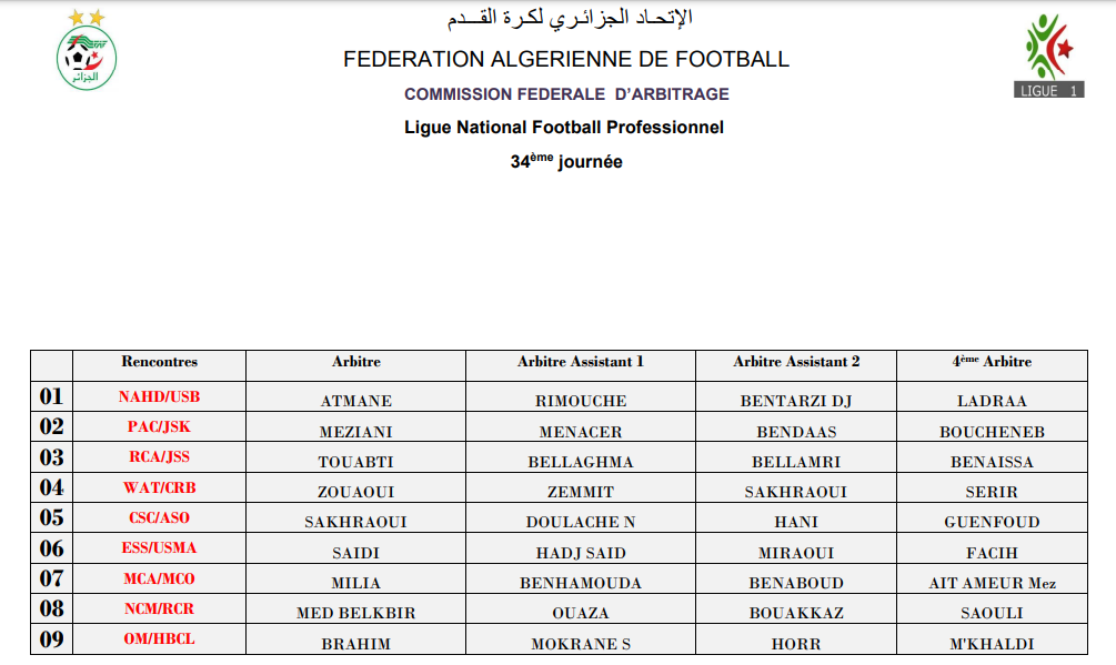 عينت لجنة التحكيم، الحكم سعيدي، لإدارة المباراة التي ستجمع وفاق سطيف، بالضيف اتحاد العاصمة، ضمن الجولة الـ34 من البطولة المحترفة.