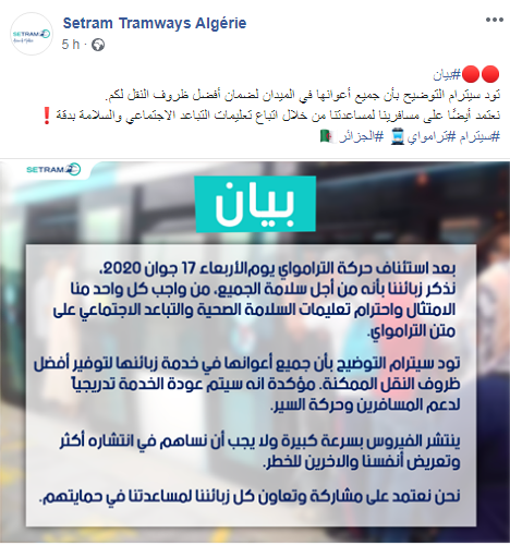 كما ذكرت الشركة “نذكر زبائننا بأنه من اجل سلامة الجميع من واجب كل منا الإمتثال وإحترام تعليمات السلامة الصحية والتباعد الاجتماعي على متن الترامواي”.