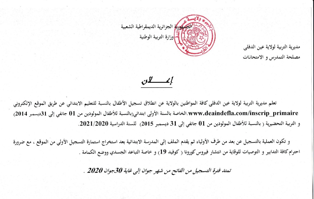 أعلنت مديرية التربية لولاية عين الدفلى، أمس الثلاثاء، عن فتح فترة التسجيلات المدرسية الخاصة بالسنة الأولى ابتدائي والتربية التحضيرية للسنة الدراسية 2020 / 2021.