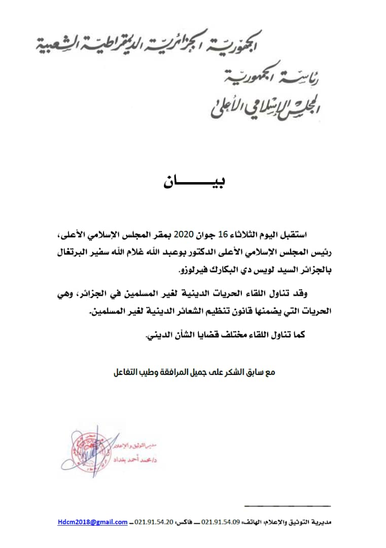 وحسب بيان للمجلس، تناول اللقاء الحريات الدينية لغير المسلمين في الجزائر، وهي الحريات التي يضمنها قانون تنظيم الشعائر الدينية لغير المسلمين.
