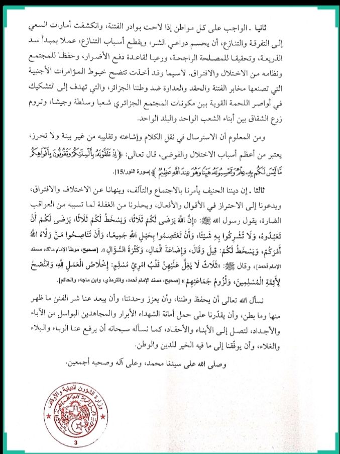 قبل أن يضيف المصدر نفسه، “أنه الواجب على كل مواطن ان يقطع أسباب التنازع والفتنة عملا بمبدأ سد الذريعة وتحقيقا للمصلحة الراجحة، ورعيا لقاعدة دفع الأضرار، وحفظا للمجتمع ونظامه من الاختلال والافتراق.”
