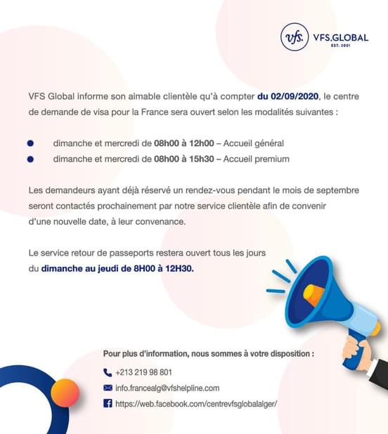 أعلن مركز “VFS GLOBAL” المتخصص في منح تأشيرات الدخول لفرنسا عن إعادة فتح أبوابه مجددا إبتداءً من تاريخ 2 سبمتبر المقبل.