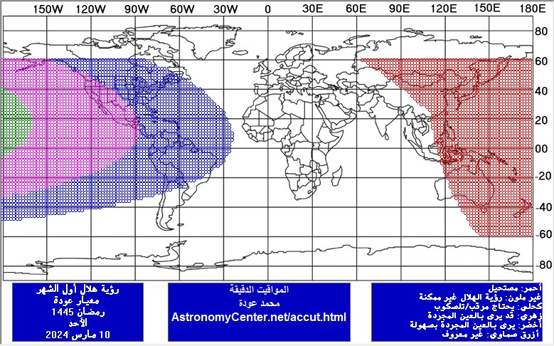 وبناء على ذلك وبالنسبة للدول التي تشترط الرؤية الصحيحة للهلال من مكان ما في العالم الإسلامي، فمن المتوقع أن تبدأ هذه الدول شهر رمضان يوم الثلاثاء 12 مارس.