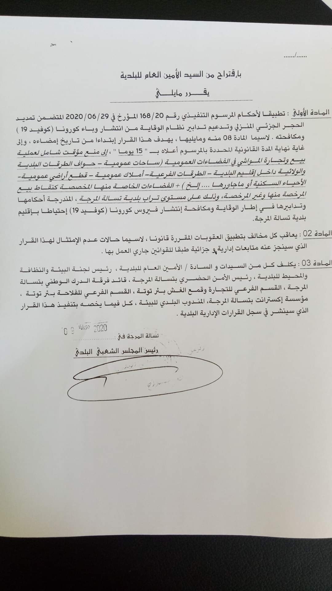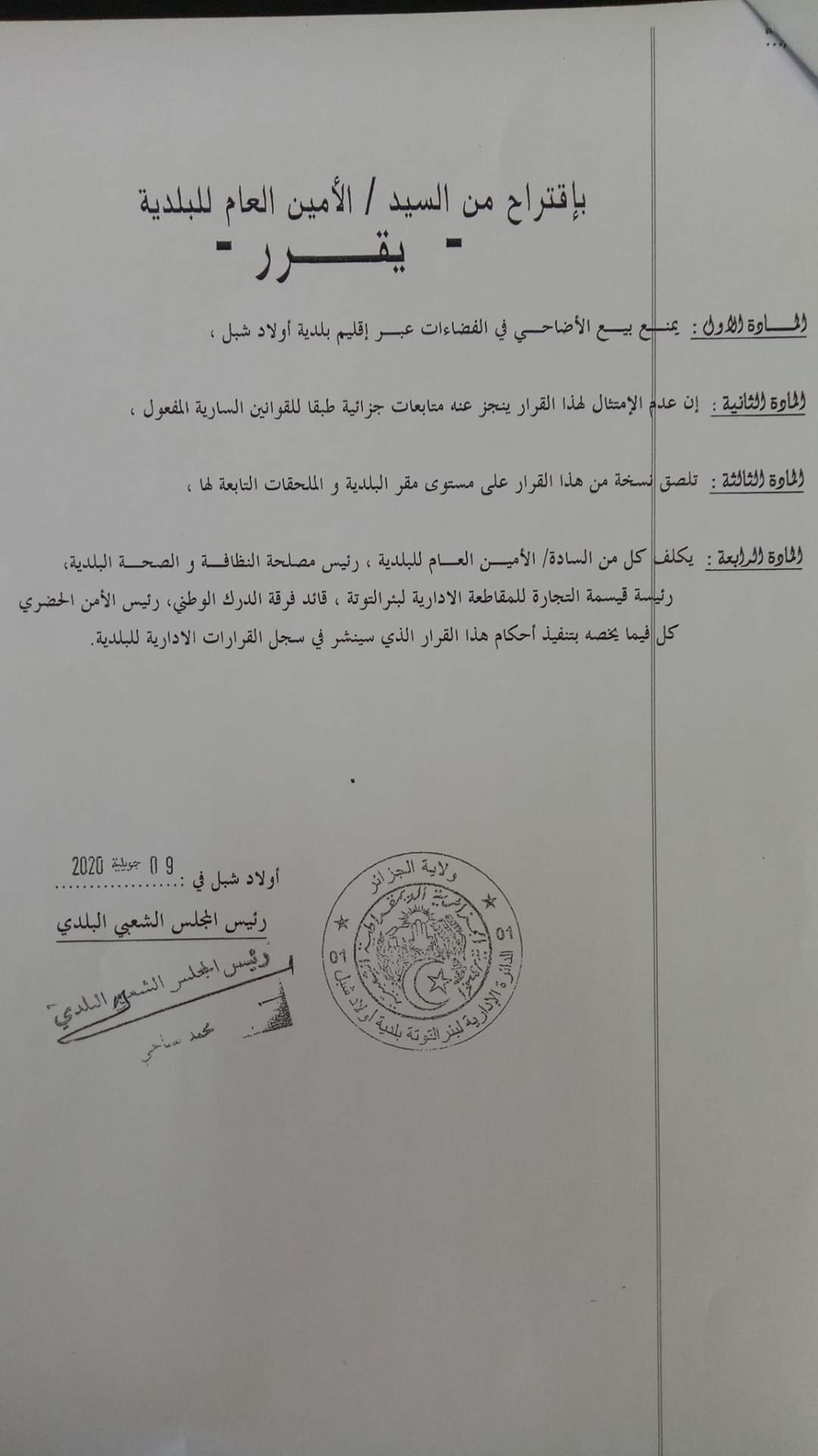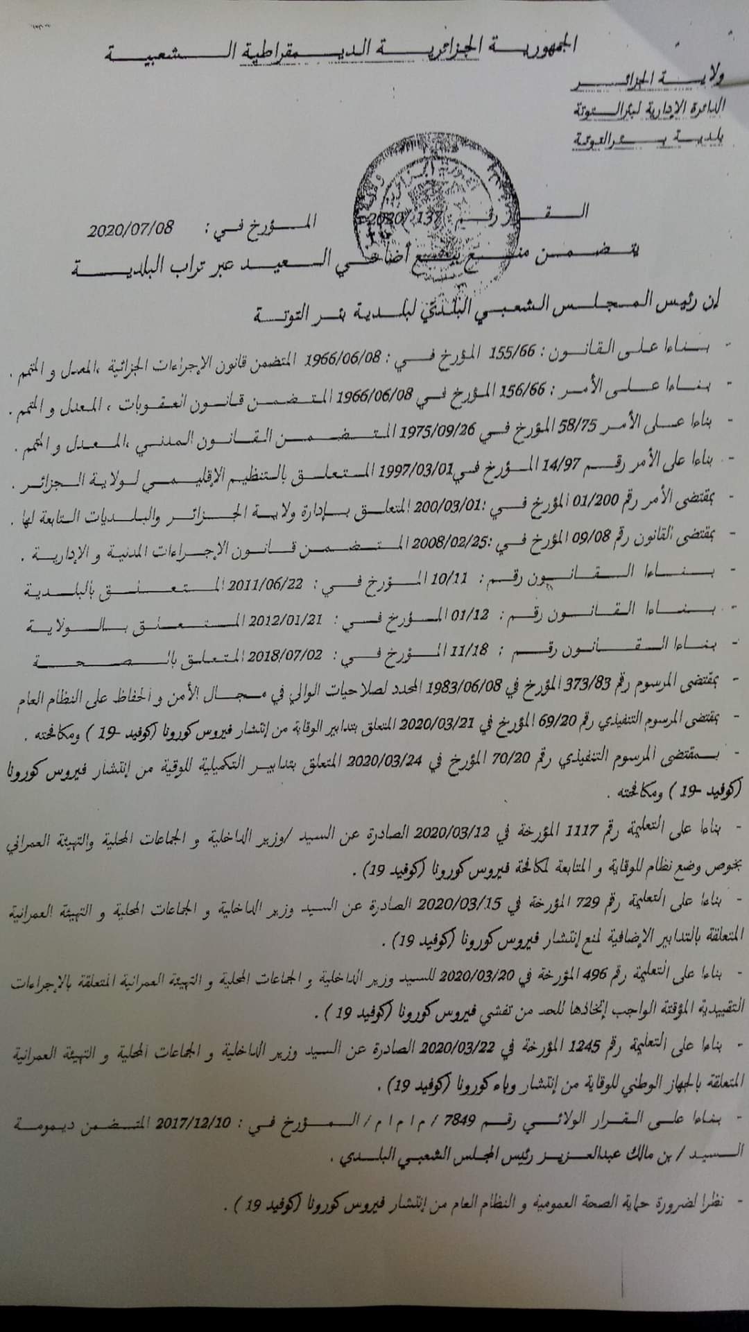 وجاء ذلك طبقا للقرار رقم 137المؤرخ في 09جويلية2020الصادر عن بلدية بئر التوتة، بالإضافة إلى القرار رقم109المؤرخ في 09جويلية2020 الصادر عن بلدية أولاد شبل، وكذا القرار رقم 53 المؤرخ في 09جويلية الصادر عن بلدية تسالة المرجة.