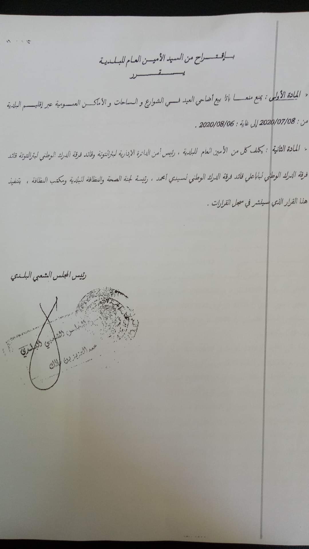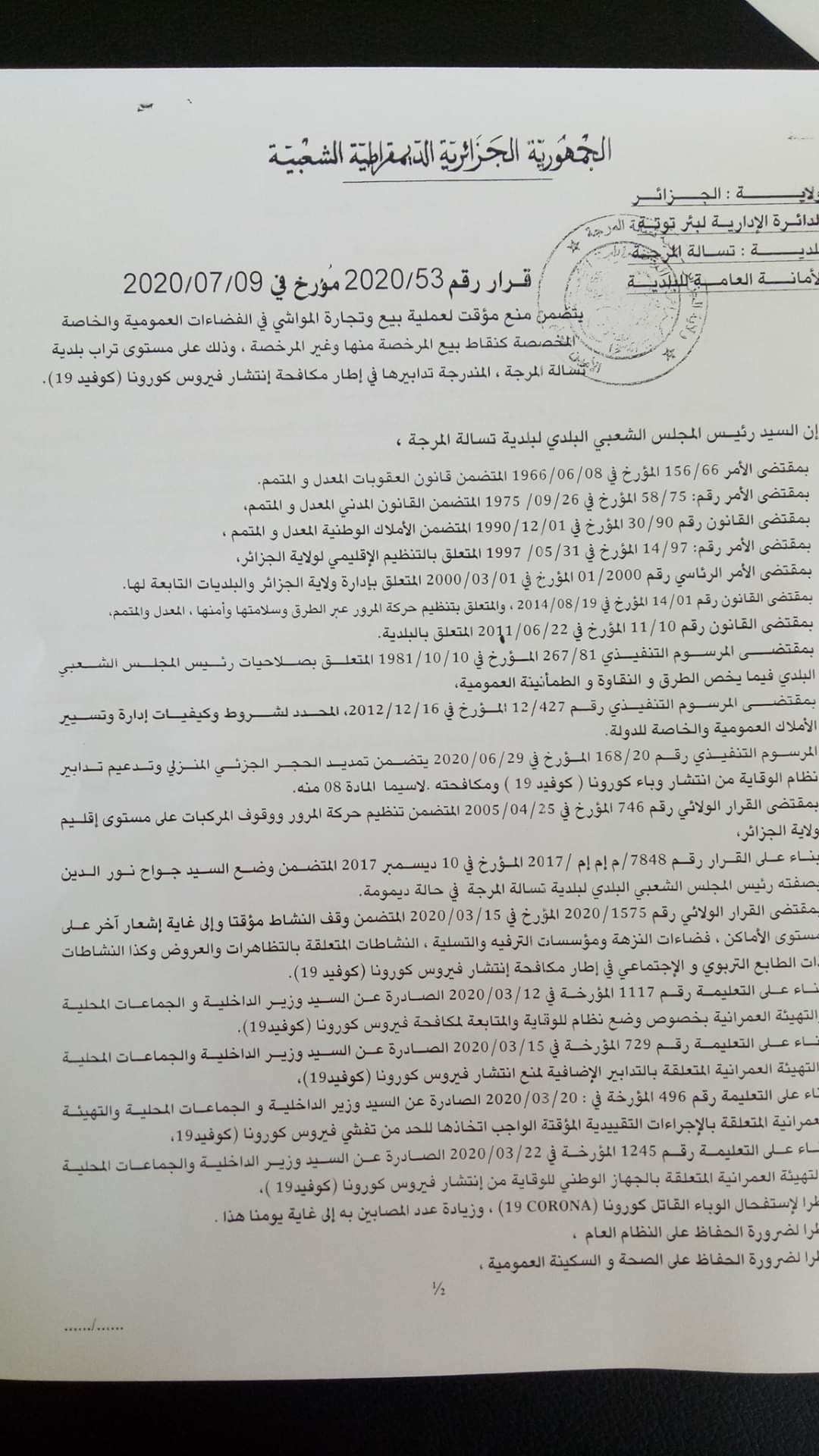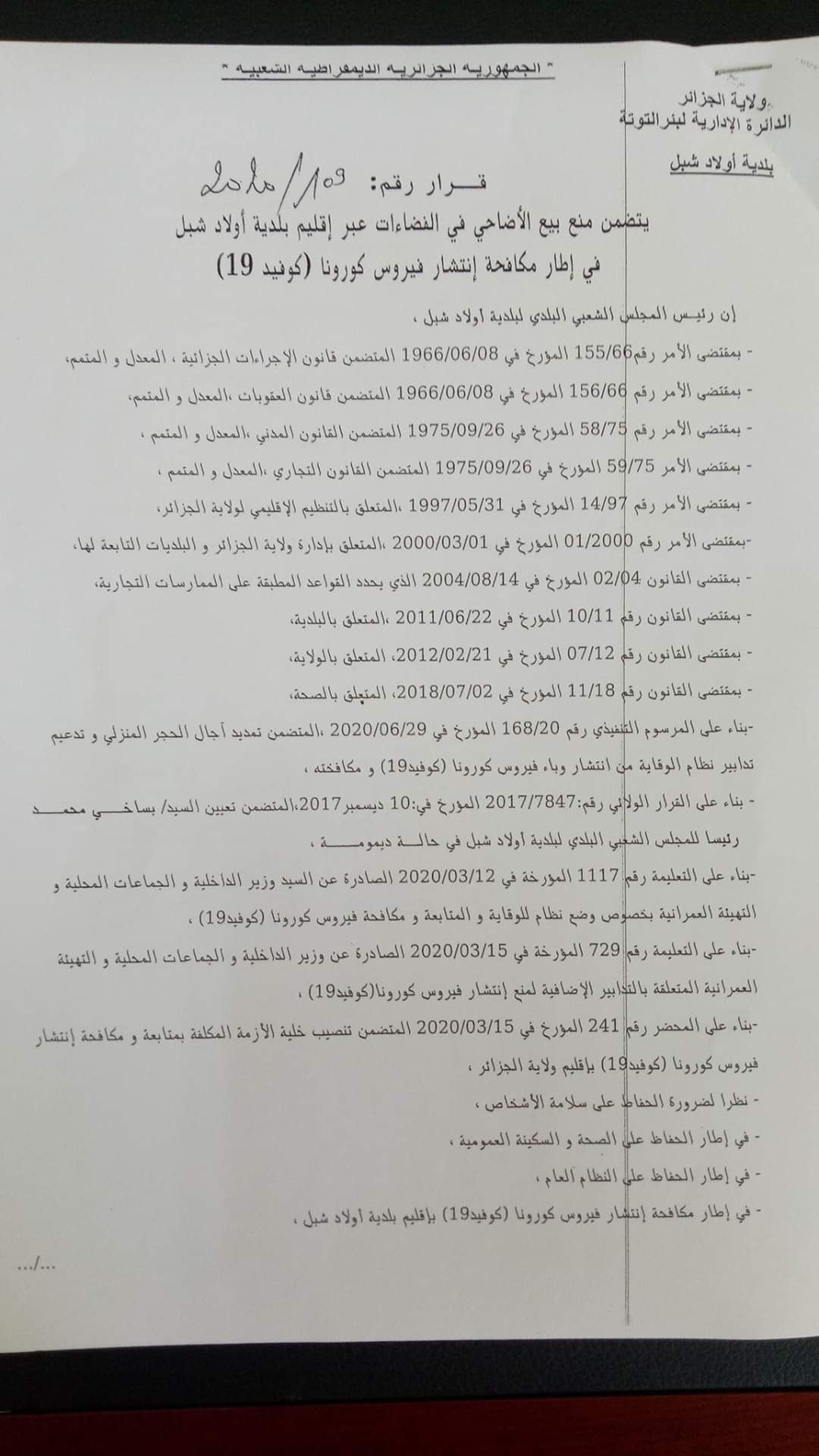 وجاء ذلك طبقا للقرار رقم 137المؤرخ في 09جويلية2020الصادر عن بلدية بئر التوتة، بالإضافة إلى القرار رقم109المؤرخ في 09جويلية2020 الصادر عن بلدية أولاد شبل، وكذا القرار رقم 53 المؤرخ في 09جويلية الصادر عن بلدية تسالة المرجة.