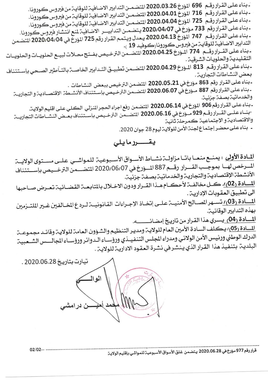 قرر اليوم والي ولاية تيارت منع مزاولة النشاط التجاري الخاص بالاسواق الأسبوعية للمواشي عبر كامل تراب الولاية.