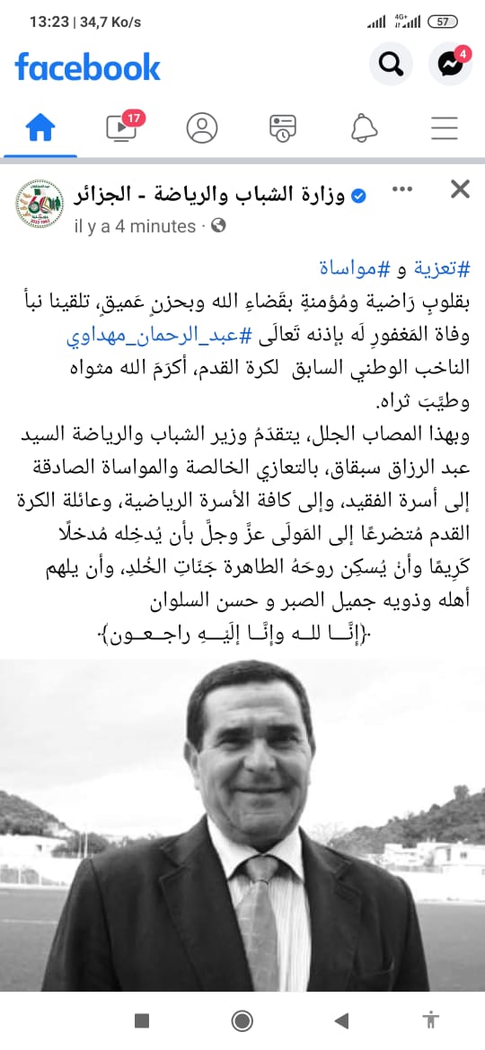 كما أضافت :”بهذا المصاب الجلل، يتقدّم وزير الشباب والرياضة عبد الرزاق سبقاق بالتعازي الخالصة والمواساة الصادقة إلى أسرة الفقيد”.